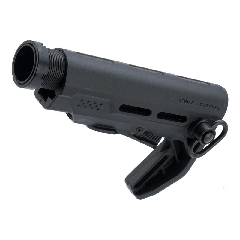 Strike Industries drop-in replacement buttstock for AR/15/M16 carbine using mil-spec sized receiver extension tubes. The Strike Industries stock integrates features sought by military professionals and firearms enthusiasts around the world. Strike Industries came up with a lighter, compact buttstock, at an even more attractive price point.