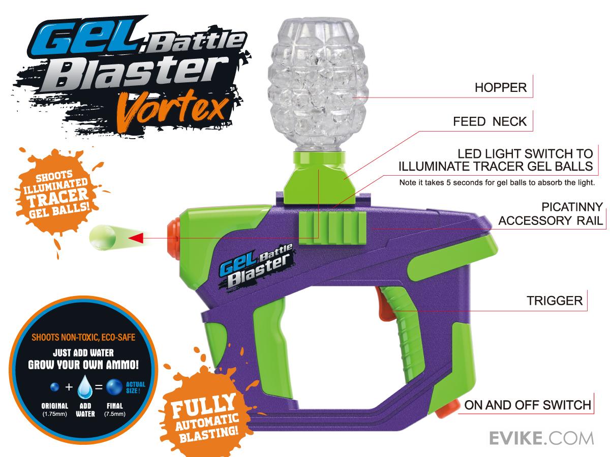 - Fully-automatic Gel Blaster Vortex pistol, powered by a rechargeable battery!
