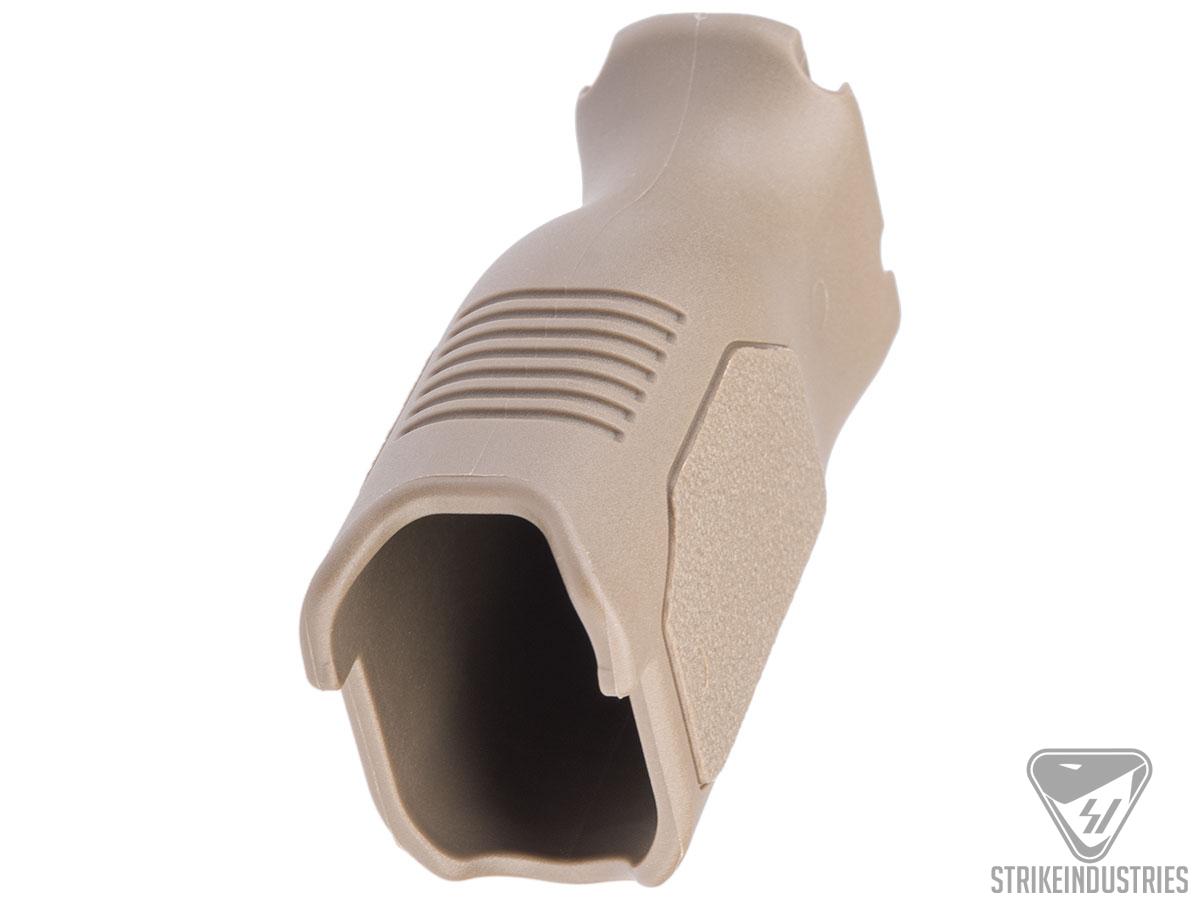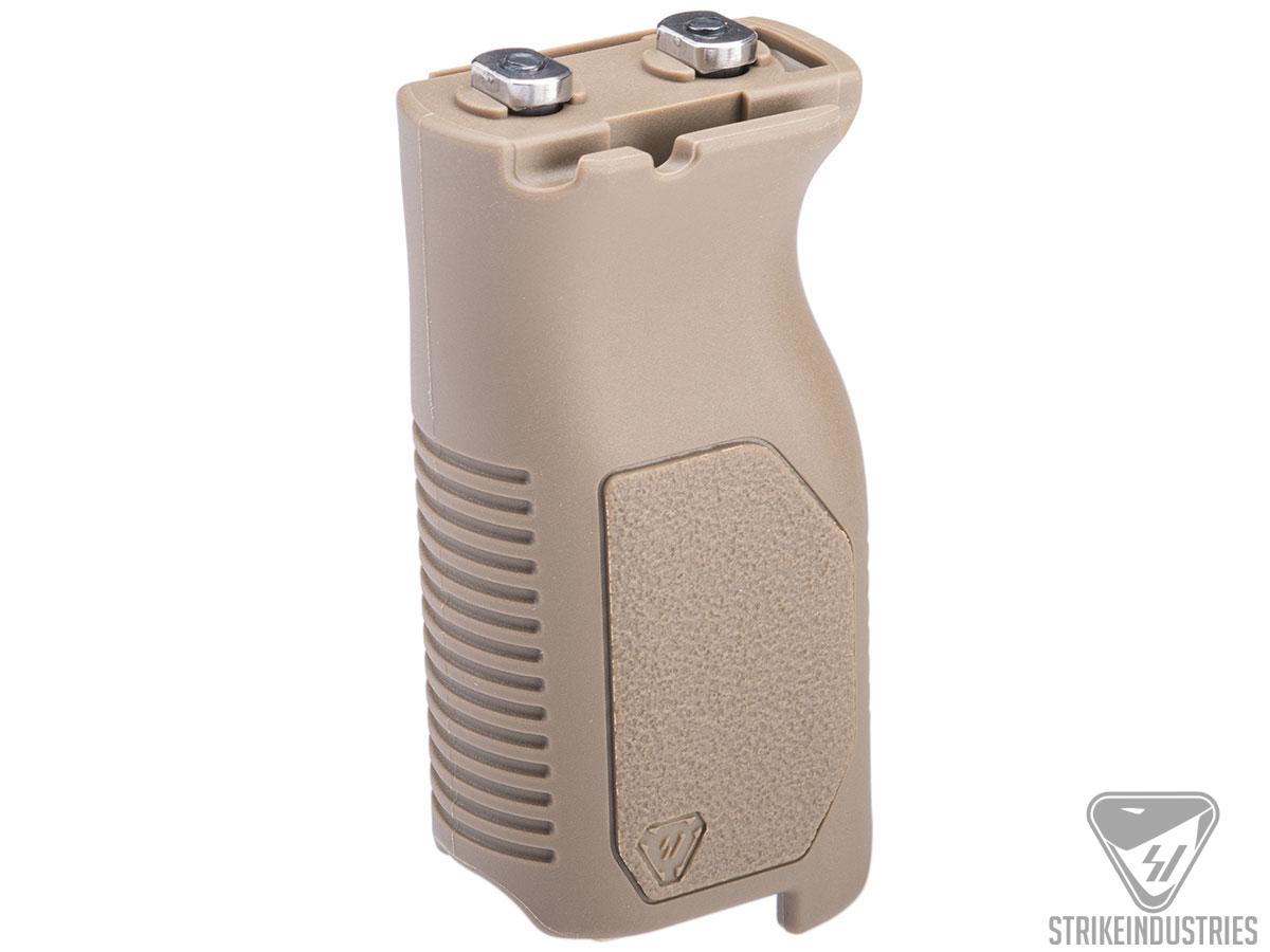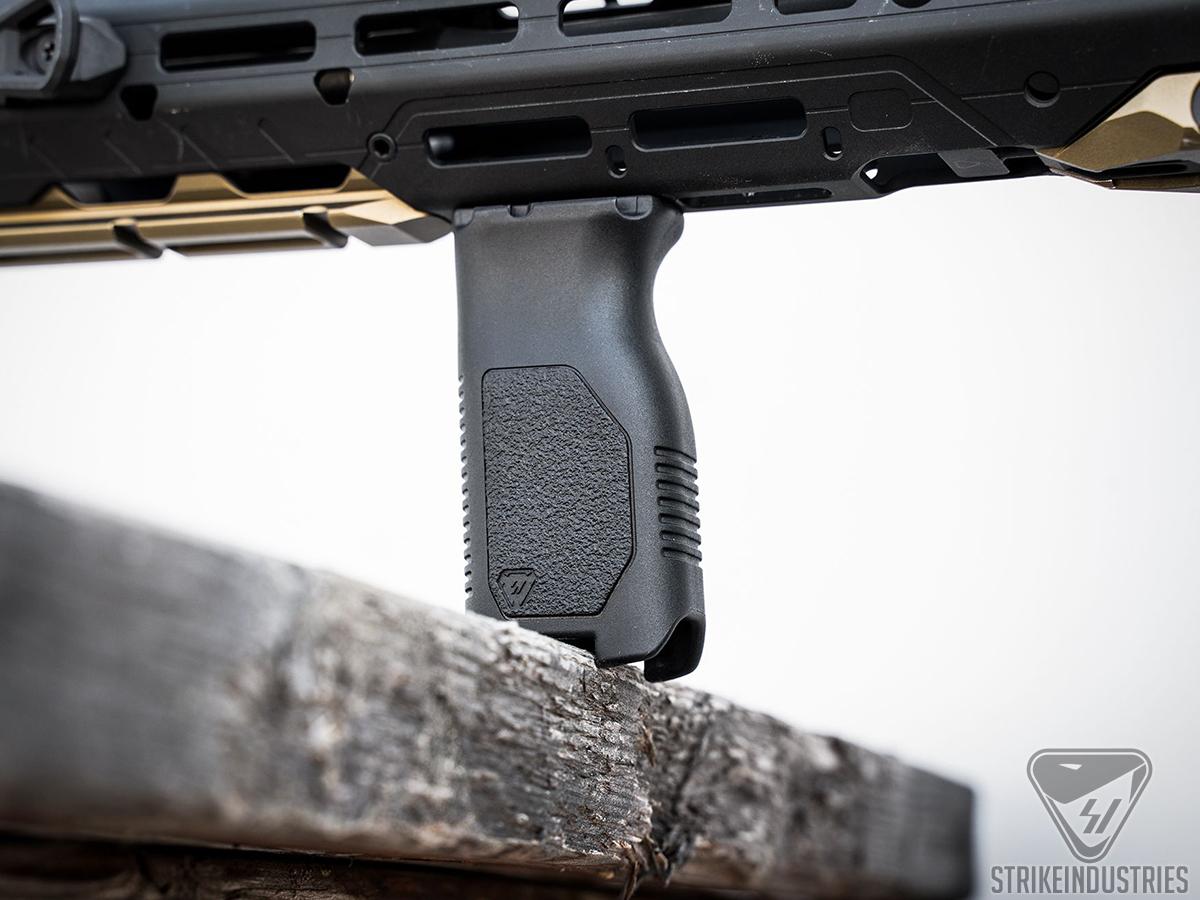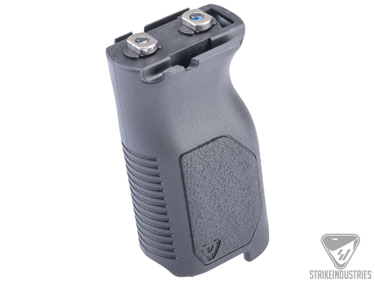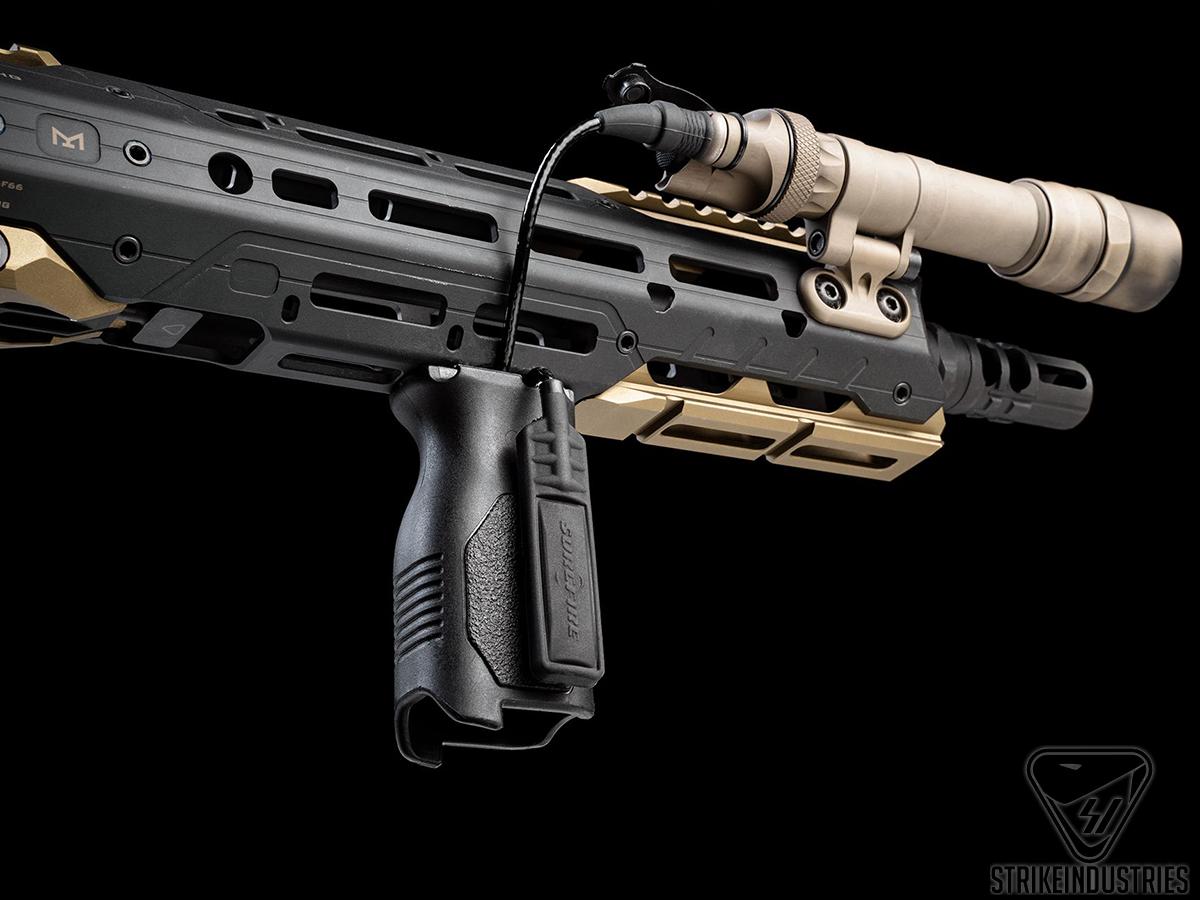 The Strike Industries Angled Vertical Grip with Cable Management (Picatinny) is engineered like no other grip on the market. The grip angle sits on the handguard at 86 degrees. The patent pending SI Cable Management System® (CMS) function enables you to organize and store excess wire from your weapon light or any other cabled accessories. Instead of tucking wire anywhere you can and using cable ties or tape to hold it down, the SI CMS will offer you a place to route and/or contain loose wire inside the grip cavity. The cuts at the top middle of the grip allow for easier pressure switch attachment. On both the Short and Long version there has an added built-in stability feature when you place the L-shaped bottom onto a table edge/corner or as a barricade stop, giving you another way to get back on target faster downrange. The Short version is a low-profile form helps to minimize snags. The forward angle provides more of a natural wrist angle and increased rigidity of forearm. Designed with textured palm and finger areas with flat sides for positive handling and easier manipulation of the firearm. Made from durable and lightweight polymer compatible with M-LOK rails, the Strike Industries Angled Vertical Grip with Cable Management gives the shooter control while handling or firing the weapon, added stability with table/edge corner or as a barricade stop and an innovative way to ensure total cable management. No messy wires.
