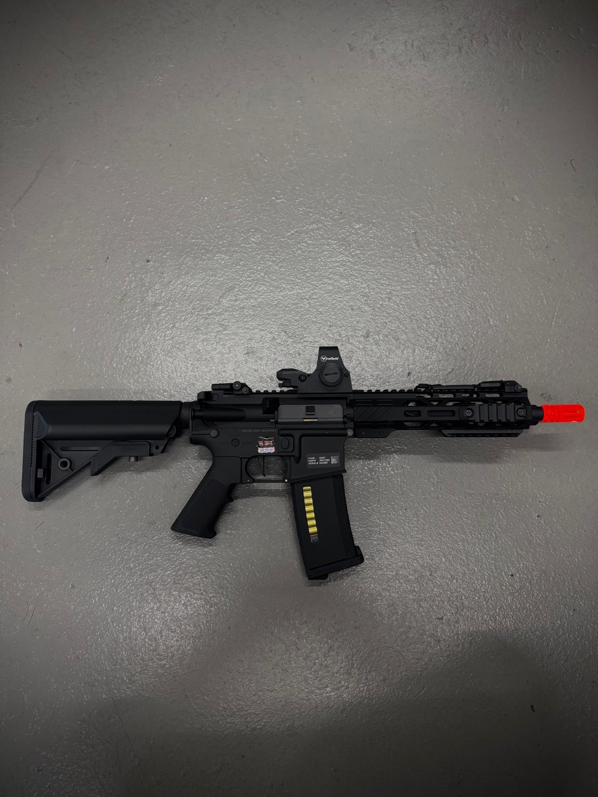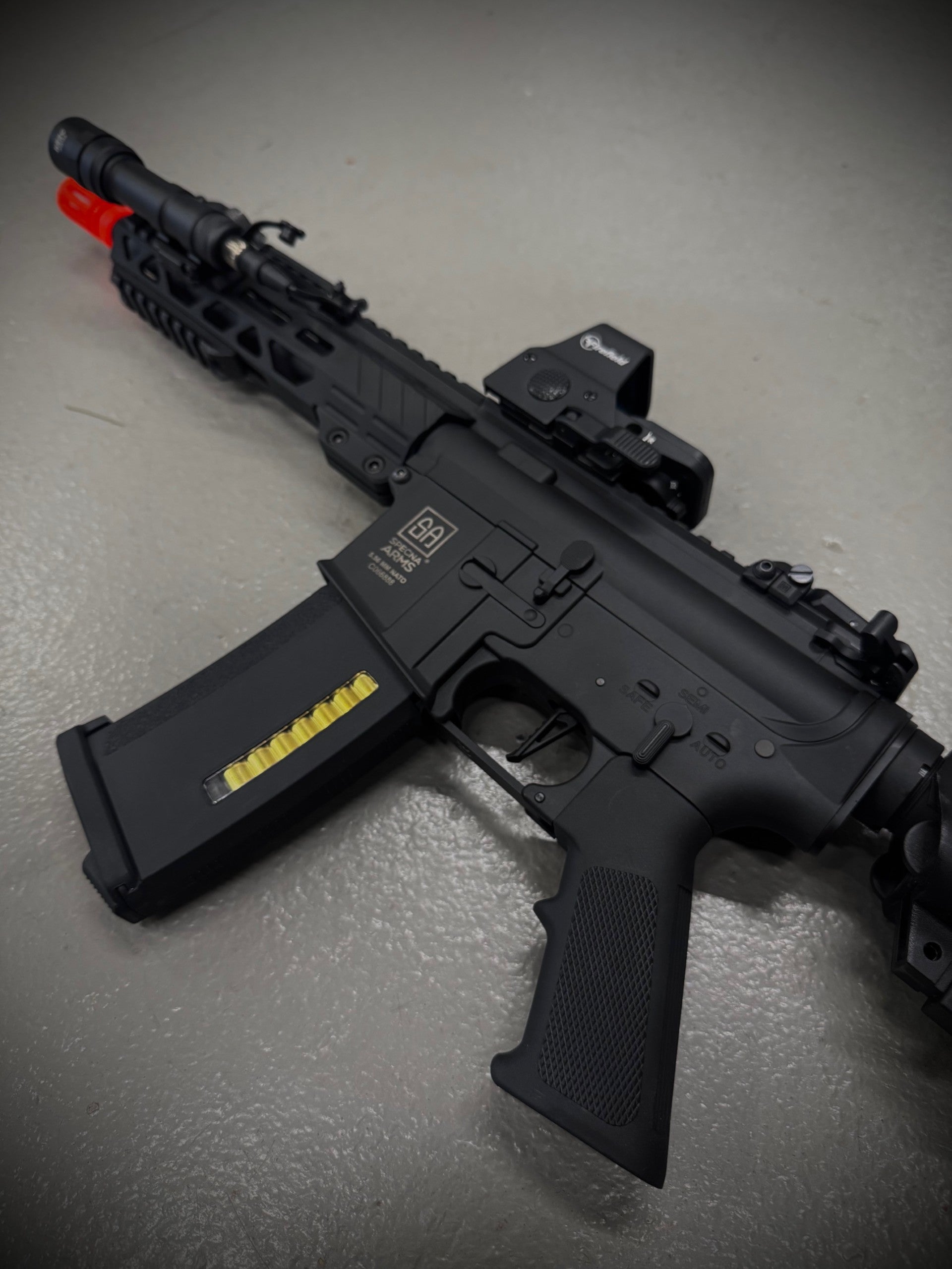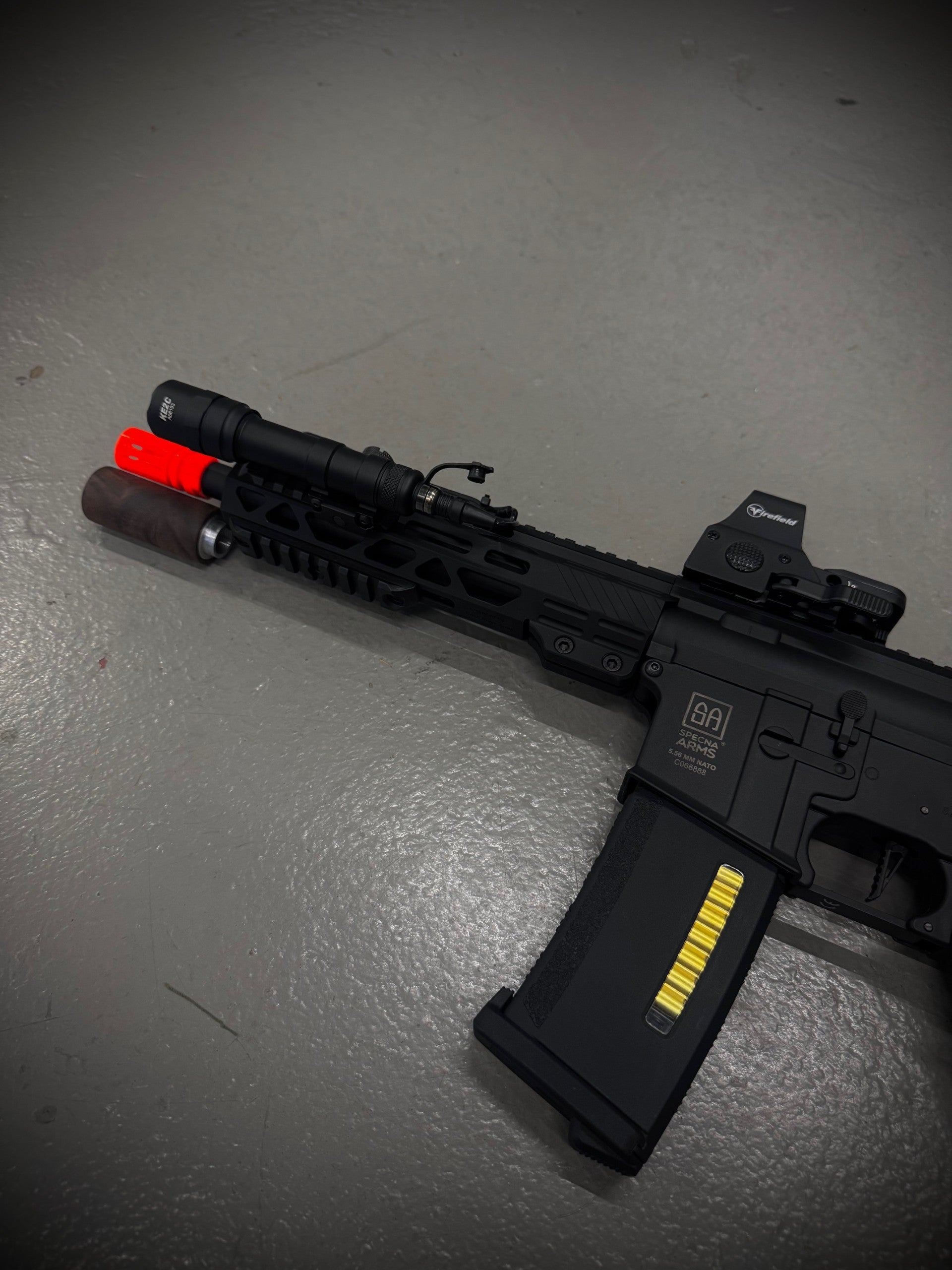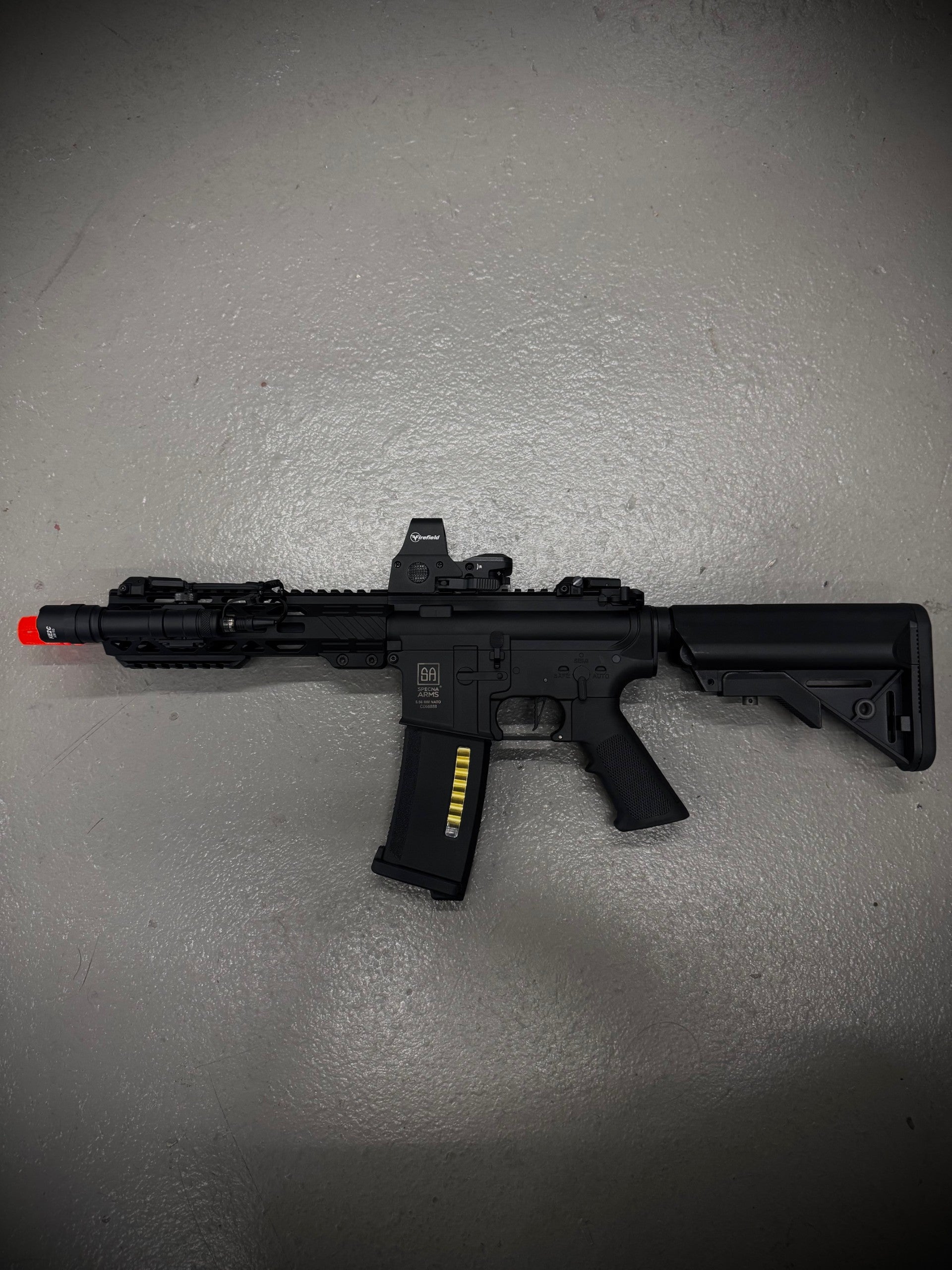 The Ghost Collection "K.D.P" C25 combines precision engineering with advanced features for serious airsoft enthusiasts. This lightweight Specna Arms C-Series CORE ETU AEG rifle in sleek black offers enhanced control through its HAL MOSFET system, ensuring reliable electronic trigger response. Equipped with a compact SBR design, integrated flashlight, red dot sight, and ghost suppressor, it delivers superior tactical versatility and stealth performance in any scenario. Ideal for players seeking a refined balance of power, accuracy, and modern aesthetics. Also comes with battery and charger.
