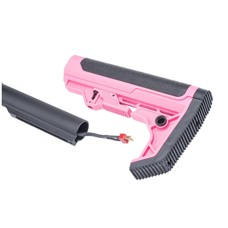 The Light Ops Stock is designed as a lightweight and durable solution for your replica. Its lightweight design comes from a simple yet ergonomic profile, while durability is ensured by its flexible polymer construction, which performs reliably across a wide range of temperatures. The stock is highly versatile, featuring a QD sling mount and a precise fit on militarystandard AR15/M4 buffer tubes. The Light Ops extendable stock includes antislip rubber inserts on both sides of the cheek pad, along with a curved rubber buttpad that rests comfortably on the user's shoulder.